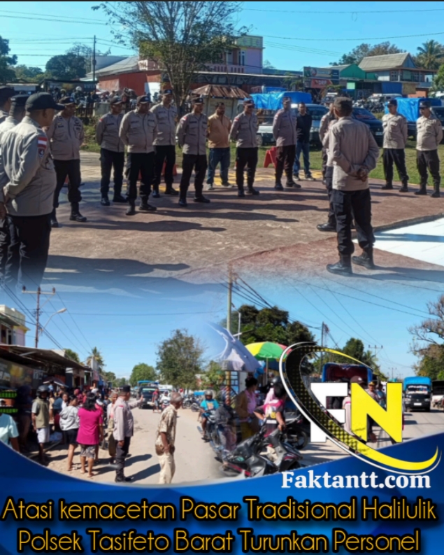 Belu, faktantt. com- Pasar Halilulik di Kabupaten Belu, Nusa Tenggara Timur (NTT), setiap hari Kamis mengalami peningkatan aktivitas jual beli yang signifikan. Hal ini menyebabkan arus lalu lintas di sekitar pasar kerap kali padat dan berpotensi menimbulkan kemacetan. Untuk mengantisipasi hal tersebut, personel Polsek Tasifeto Barat (Tasbar) Polres Belu secara rutin melakukan pengaturan lalu lintas dan penyeberangan pejalan kaki.