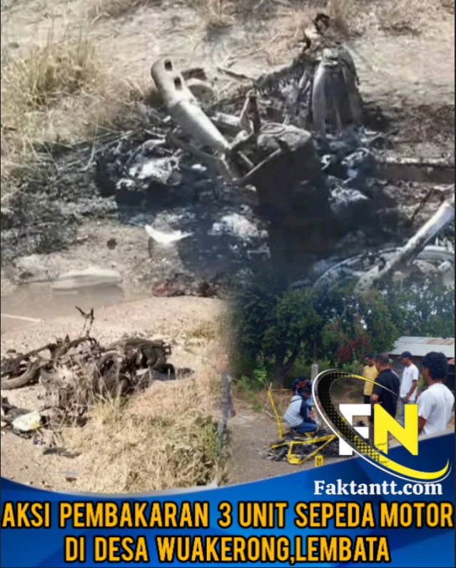 Lembata, faktantt. Com – Jurnalis dan akademisi, Lejap Yuliyant Angelomestius, S.Fil, mengecam keras aksi pembakaran tiga sepeda motor dan pencurian satu unit lainnya yang terjadi di Desa Wuakerong, Kecamatan Nagawutung, Kabupaten Lembata, Nusa Tenggara Timur (NTT). Ia mendesak aparat penegak hukum, khususnya Polres Lembata dan Polsek Loang, untuk mengusut tuntas kasus ini dan menindak tegas para pelaku sesuai hukum yang berlaku.