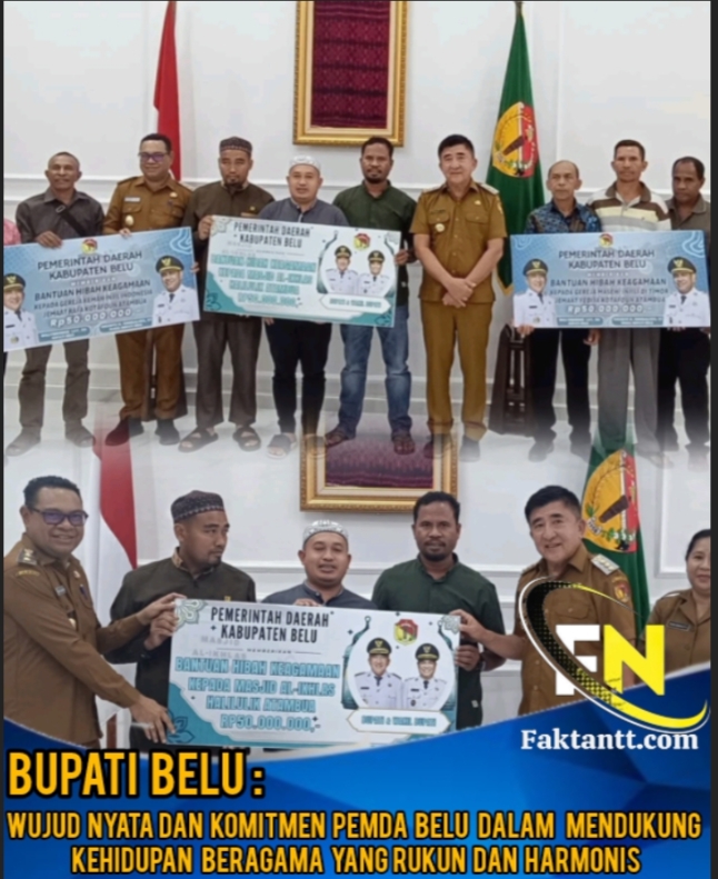 Atambua, faktantt.com – Pemerintah Kabupaten Belu, dibawah kepemimpinan Bupati Willybrodus Lay, SH dan Wakil Bupati Vicente Hornai Gonsalves, ST, terus menunjukkan komitmennya dalam mendukung kerukunan antar umat beragama. Hal ini dibuktikan dengan penyerahan dana hibah keagamaan secara simbolis kepada tiga tempat ibadah di Kabupaten Belu, Senin (4/8/2025).