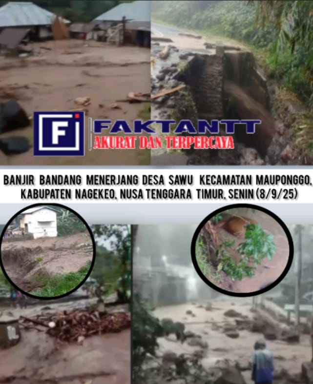 Nagekeo, faktantt.Com – Banjir bandang kembali menerjang Desa Sawu, Kecamatan Mauponggo, Kabupaten Nagekeo, Nusa Tenggara Timur, pada Senin (8/9/2025) sore. Hujan deras yang mengguyur sejak Minggu (7/9/2025) menyebabkan Sungai Maumbena meluap dan merendam permukiman serta lahan pertanian warga.