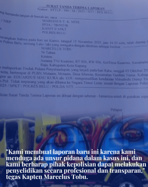 Laporan baru tersebut diterima oleh Kanit SPKT Polres Belu, Kamis, 13 November 2025, pukul 14.30 WITA, sebagaimana tertuang dalam Surat Tanda Terima Laporan (STTL) Nomor: STTLP/300/XI/2025/NTT/RES BELU.