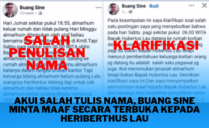 ”Sebenarnya yang datang pagi itu bukan Bapak Hubertus Lau, tetapi menurut pemberitahuan keluarga korban, orang yang datang itu adalah salah satu pegawai yang juga ikut menemukan jenazah almarhum,” tulis Buang Sine dalam unggahan klarifikasinya.